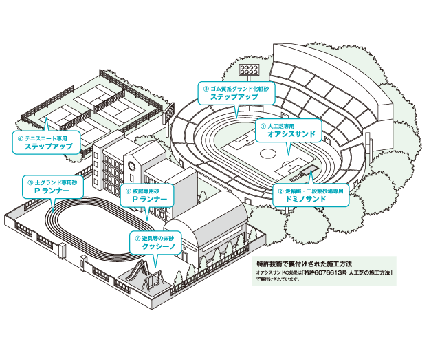 オアシスサンドの効果は「特許6076613号 人工芝の施工方法」で裏付けされています。